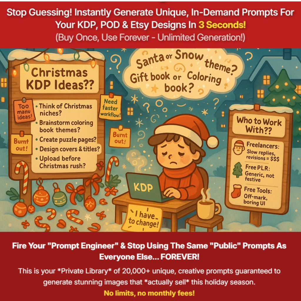 Create bestselling Christmas books in minutes using AI-ready prompts. No experience needed. One-click ideas → covers → interiors. Perfect for KDP & POD creators this season.